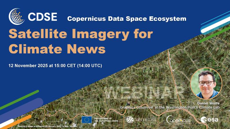 Join us for our next Copernicus Data Space Ecosystem (CDSE) webinar, "Satellite Imagery for Climate News," on November 12, 2025. This session is especially recommended for journalists, researchers, and anyone interested in how Earth Observation data shapes our understanding of climate change.